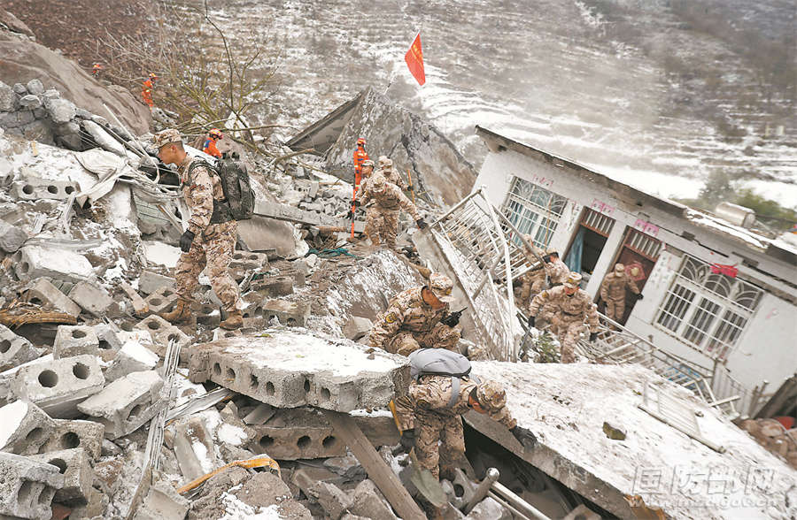 1月22日6时许,云南昭通市镇雄县塘房镇凉水村发生山体滑坡,驻滇部队官兵和民兵闻令而动,迅速投入抢险救援,全力保护人民群众生命财产安全。图为搜救被困人员。赵明军 摄