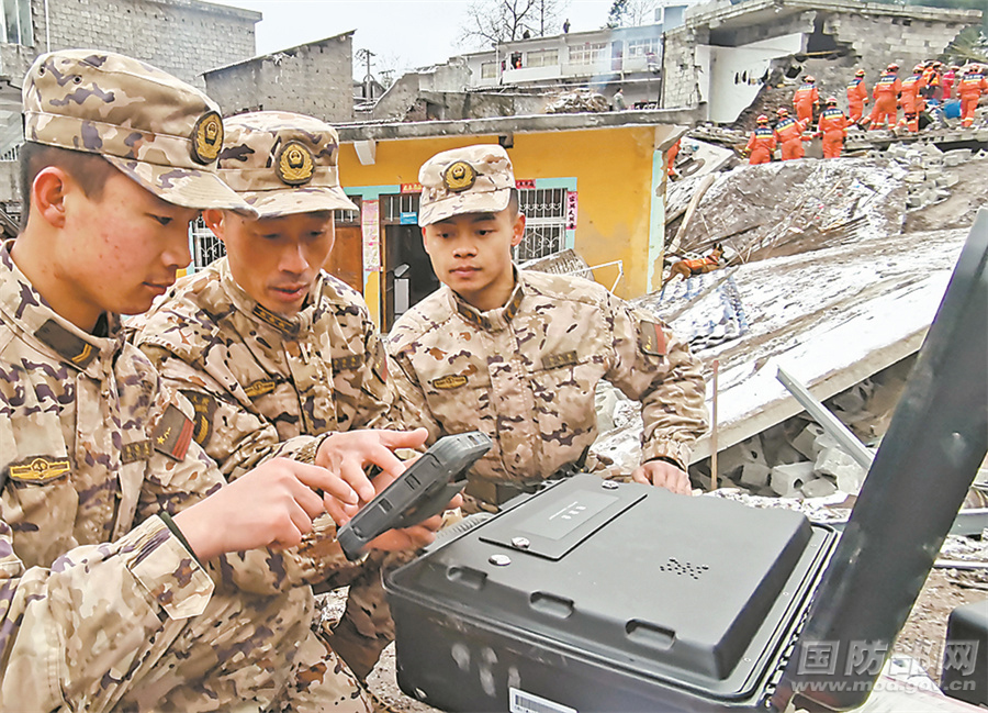 1月22日6时许,云南昭通市镇雄县塘房镇凉水村发生山体滑坡,驻滇部队官兵和民兵闻令而动,迅速投入抢险救援,全力保护人民群众生命财产安全。图为官兵利用生命探测仪进行搜救。赵明军 摄
