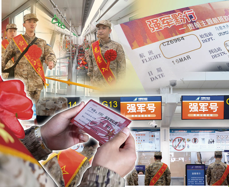 3月羊城,广州南站站台上,“强军号”高铁新兵运输专线列车迎面驶来。新兵刘国旭攥着印有“强军新征程”字样的纪念车票,和新战友一同登车。几乎与此同时,千里之外的贵阳龙洞堡国际机场,“强军号”空中新兵运输专线同步启动。数百名新兵在主题值机柜台前优先办理登机手续,快速通过绿色安检通道,踏上为国戍边的征程。陆地与天空,两条专线,串联起家乡与军营,开启了新兵军旅生涯的序幕。