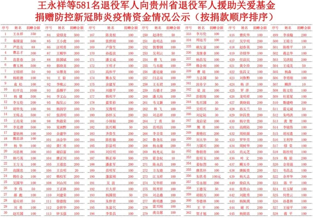 新冠肺炎疫情发生以来,在贵州省各级退役军人事务系统和省慈善组织的倡议下,广大退役军人积极响应,发动战友和身边爱心人士为疫情防控一线捐款捐物。截至2月21日,“贵州省退役军人援助关爱基金”已累计接到1600余名退役军人共7批次捐款354500余元,专项用于支助贵州、湖北新冠肺炎疫情防控工作。每一笔捐赠资金已通过省慈善总会官网和“慈善贵州”微信公众号公示,并按捐赠人捐赠意向划拨到捐赠地支持一线疫情防控。据初步统计,全省退役军人同期参加“战疫”近12万人次,捐款192.62万余元,捐赠口罩21800余个、防护服600余套、消毒液及酒精4.5吨、其他医疗物资2302件(套)、生产生活物资10000余件支援各地疫情防控工作。