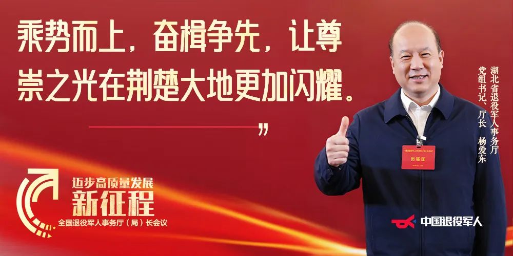 接续奋斗,谱写荆楚尊崇新篇章,推动体制机制更加完善、安置就业更有质量、抚恤优待稳步提升、服务保障精准高效、高质量发展取得新突破,为湖北加快建成全国构建新发展格局先行区贡献退役军人工作力量。