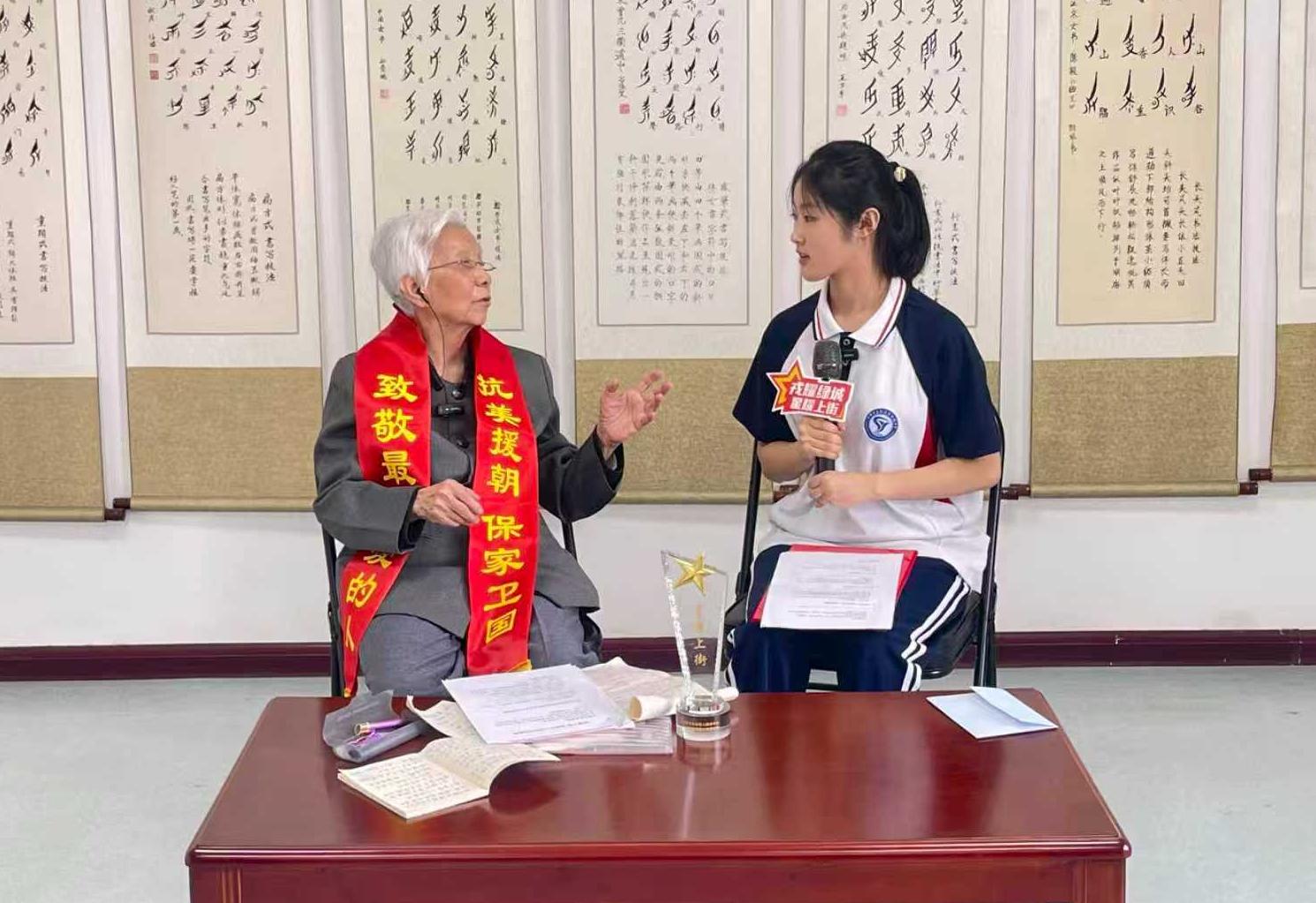 抗美援朝老兵任珺(左)向学生代表、服务队志愿者范幸子讲述战场经历。 田 云 摄