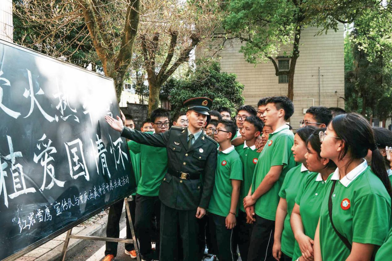 2025年4月,信息支援部队工程大学通信士官学校学员向重庆西藏中学学生介绍军营日活动方案。