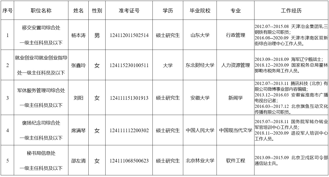 退役军人事务部2020年度拟录用公务员名单
