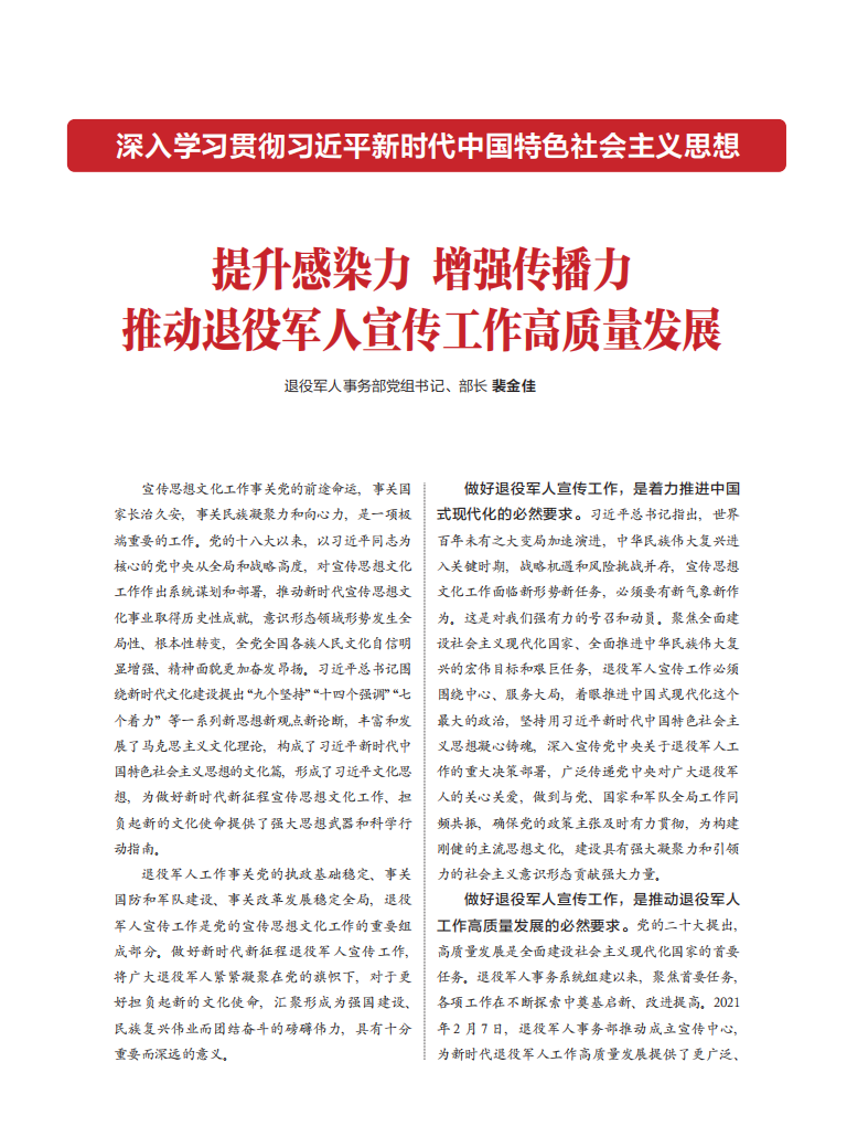 《中国退役军人》杂志2024年第6期发表退役军人事务部党组书记、部长裴金佳署名文章《提升感染力 增强传播力 推动退役军人宣传工作高质量发展》,全文如下——