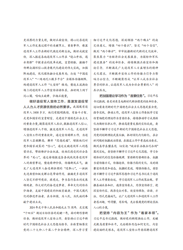 把加强理论学习作为“首要任务”。习近平总书记强调,要更好肩负起新时代新征程党的使命任务,迫切需要用新时代中国特色社会主义思想武装全党、指导实践、推动工作。退役军人宣传工作要把学习宣传贯彻党的理论作为首要任务,持续推动学习成果转化为做好本职工作、推动高质量发展的实际成效。要坚持不懈学习习近平新时代中国特色社会主义思想,用党的创新理论武装头脑,抓好深化内化转化,在分析问题时把握政治因素,在报道工作中考虑政治要求,做到真学真懂真用,切实把“政治家办报办刊办网”落到实处。要坚持不懈学习习近平文化思想,学习全媒体时代的信息传播规律,紧跟新形势新任务,把握当前传播方式、传播途径、传播手段的变化,及时调整宣传角度和姿态,把握时度效,增强传播力。要坚持不懈学习习近平强军思想和习近平总书记关于退役军人工作重要论述,学习退役军人工作政策法规,掌握基础业务知识,选准宣传要点、用准宣传语言、挖深宣传内容、找准受众对象,使宣传理念、话语、方法、形式更接地气,让广大退役军人和退役军人工作者感兴趣、听得懂、有共鸣,充分展现党的理论直抵人心的力量。