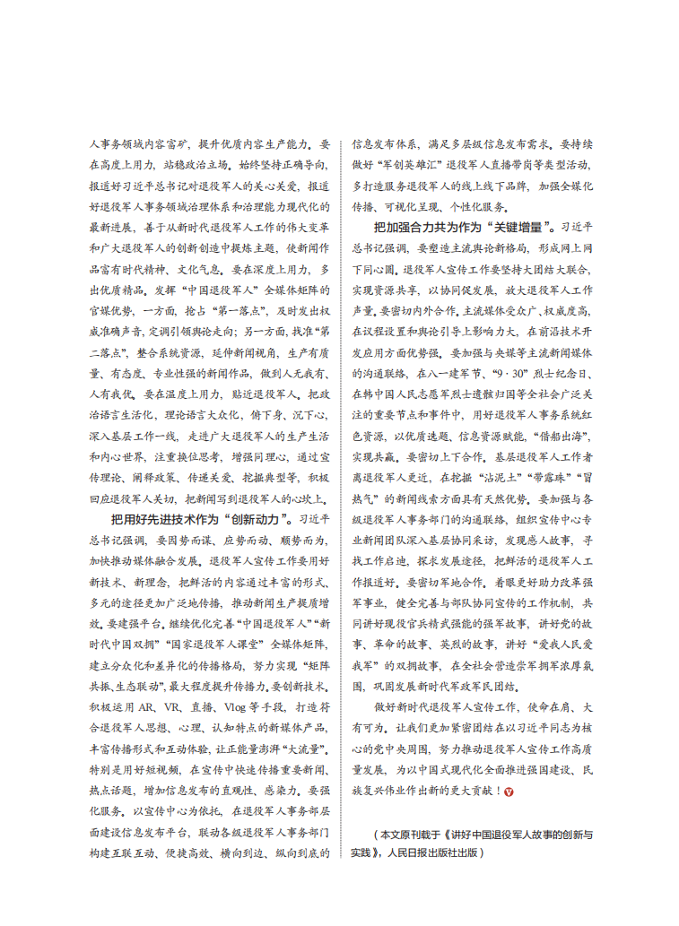 把用好先进技术作为“创新动力”。习近平总书记强调,要因势而谋、应势而动、顺势而为,加快推动媒体融合发展。退役军人宣传工作要用好新技术、新理念,把鲜活的内容通过丰富的形式、多元的途径更加广泛地传播,推动新闻生产提质增效。要建强平台。继续优化完善“中国退役军人”“新时代中国双拥”“国家退役军人课堂”全媒体矩阵,建立分众化和差异化的传播格局,努力实现“矩阵共振、生态联动”,最大程度提升传播力。要创新技术。积极运用AR、VR、直播、Vlog等手段,打造符合退役军人思想、心理、认知特点的新媒体产品,丰富传播形式和互动体验,让正能量澎湃“大流量”。特别是用好短视频,在宣传中快速传播重要新闻、热点话题,增加信息发布的直观性、感染力。要强化服务。以宣传中心为依托,在退役军人事务部层面建设信息发布平台,联动各级退役军人事务部门构建互联互动、便捷高效、横向到边、纵向到底的信息发布体系,满足多层级信息发布需求。要持续做好“军创英雄汇”退役军人直播带岗等类型活动,多打造服务退役军人的线上线下品牌,加强全媒化传播、可视化呈现、个性化服务。