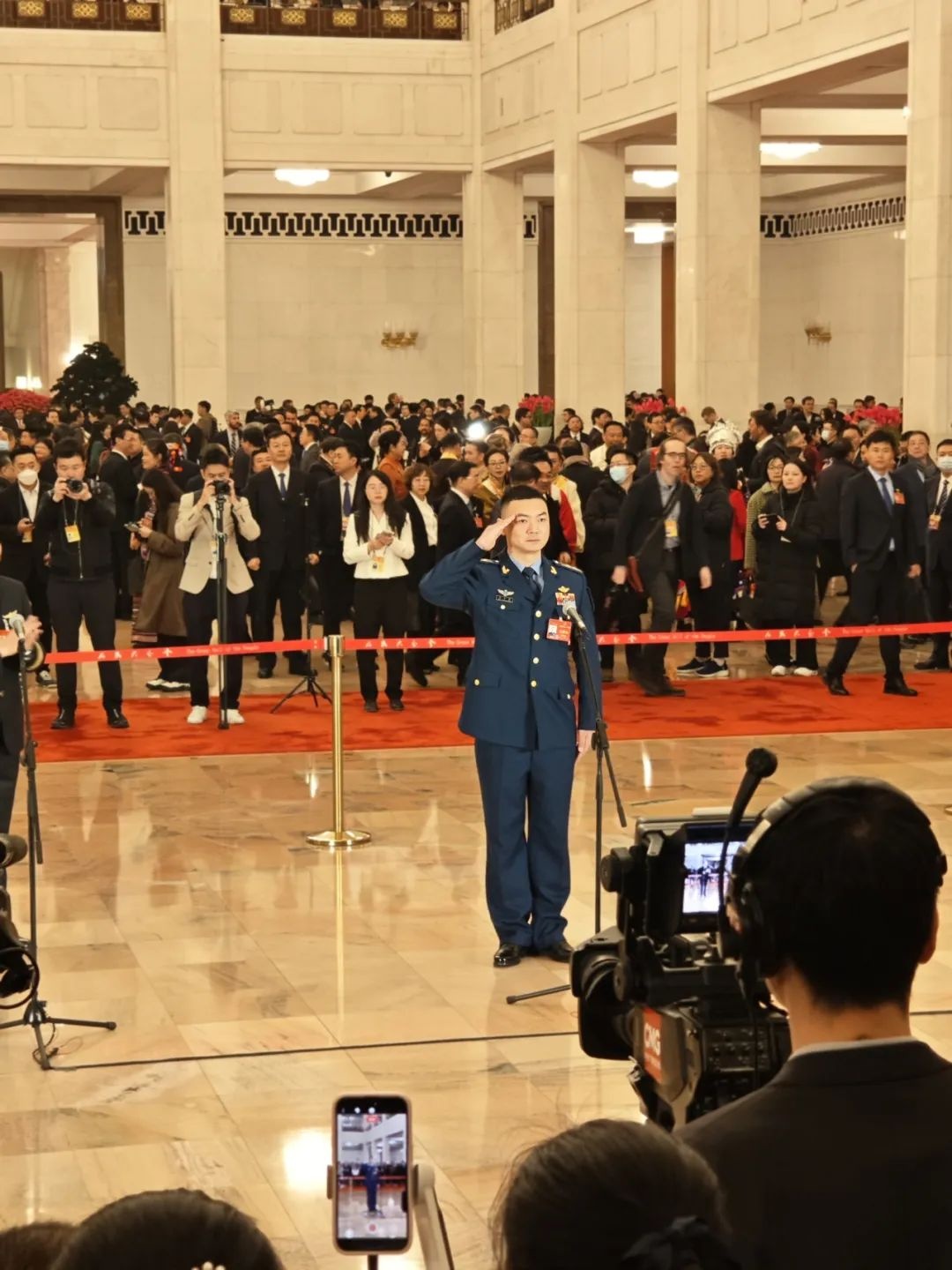 全国人大代表、空军航空兵某旅飞行员高中强在“代表通道”回答记者提问。中国军网记者 刘妍 摄