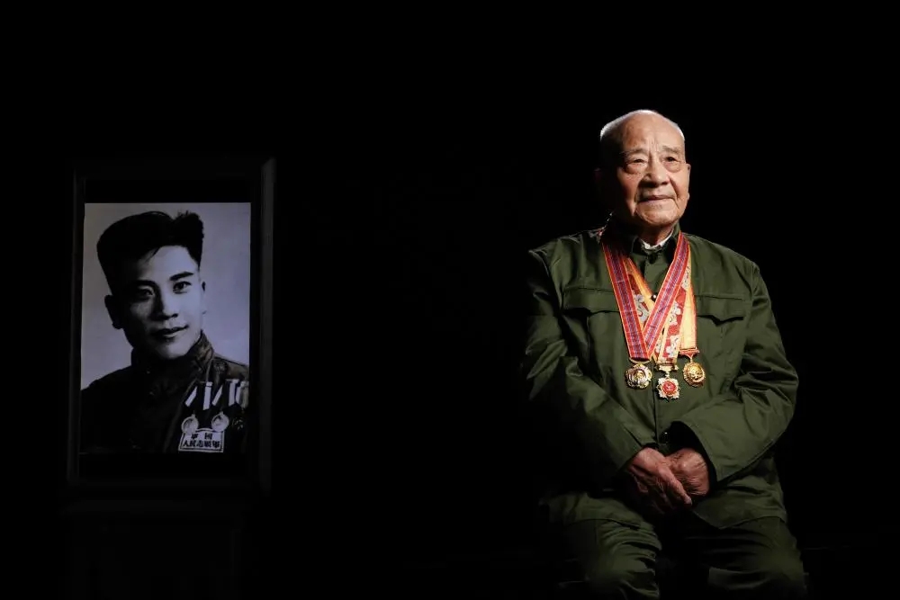 这是96岁的抗战老战士宋金堦与自己年轻时的戎装照合影(9月25日摄)。