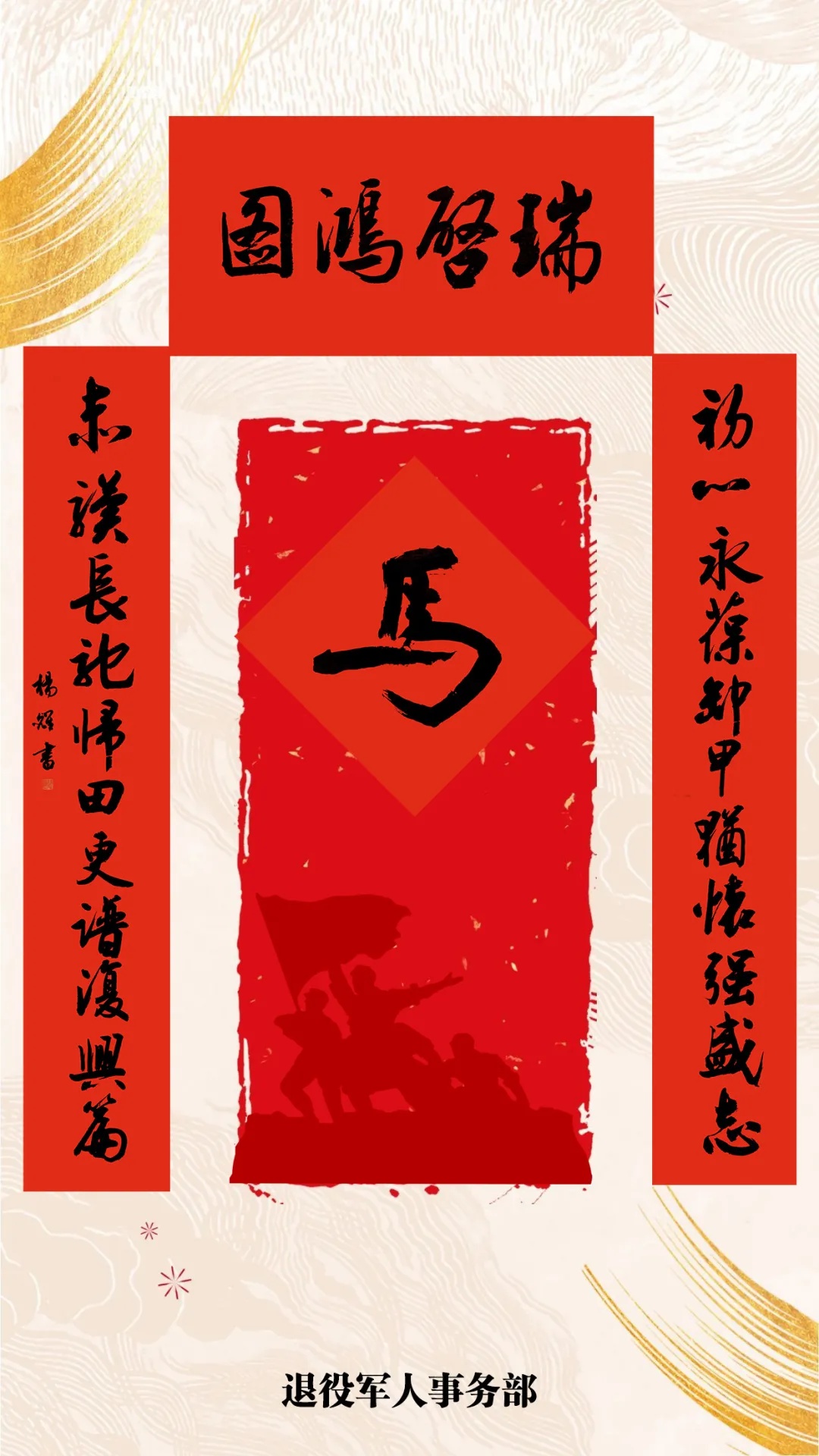骏马迎春贺新岁,老兵同心铸华章。新春佳节即将来临之际,为展现退役军人对党忠诚、蓬勃向上的精神风貌,营造尊崇尊重浓厚氛围,退役军人事务部商请中国楹联学会为退役军人创作了2026年春节主题春联,特邀请卢中南、龙开胜、张维忠、杨耀等四名优秀军旅书法家进行书写,向广大退役军人送上新春祝福。恭祝大家新春快乐、阖家幸福、万事如意、瑞启鸿图!