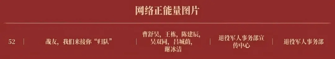 入选的4件作品中,“戎装”入选十佳网络精品网络正能量图片。“‘山河铭记 英雄回家’第十二批在韩中国人民志愿军烈士遗骸回国”入选网络正能量专题专栏;“战友,我们来接你‘归队’”入选网络正能量图片;“九三阅兵,退役军人这样接受检阅!”入选网络正能量文字。