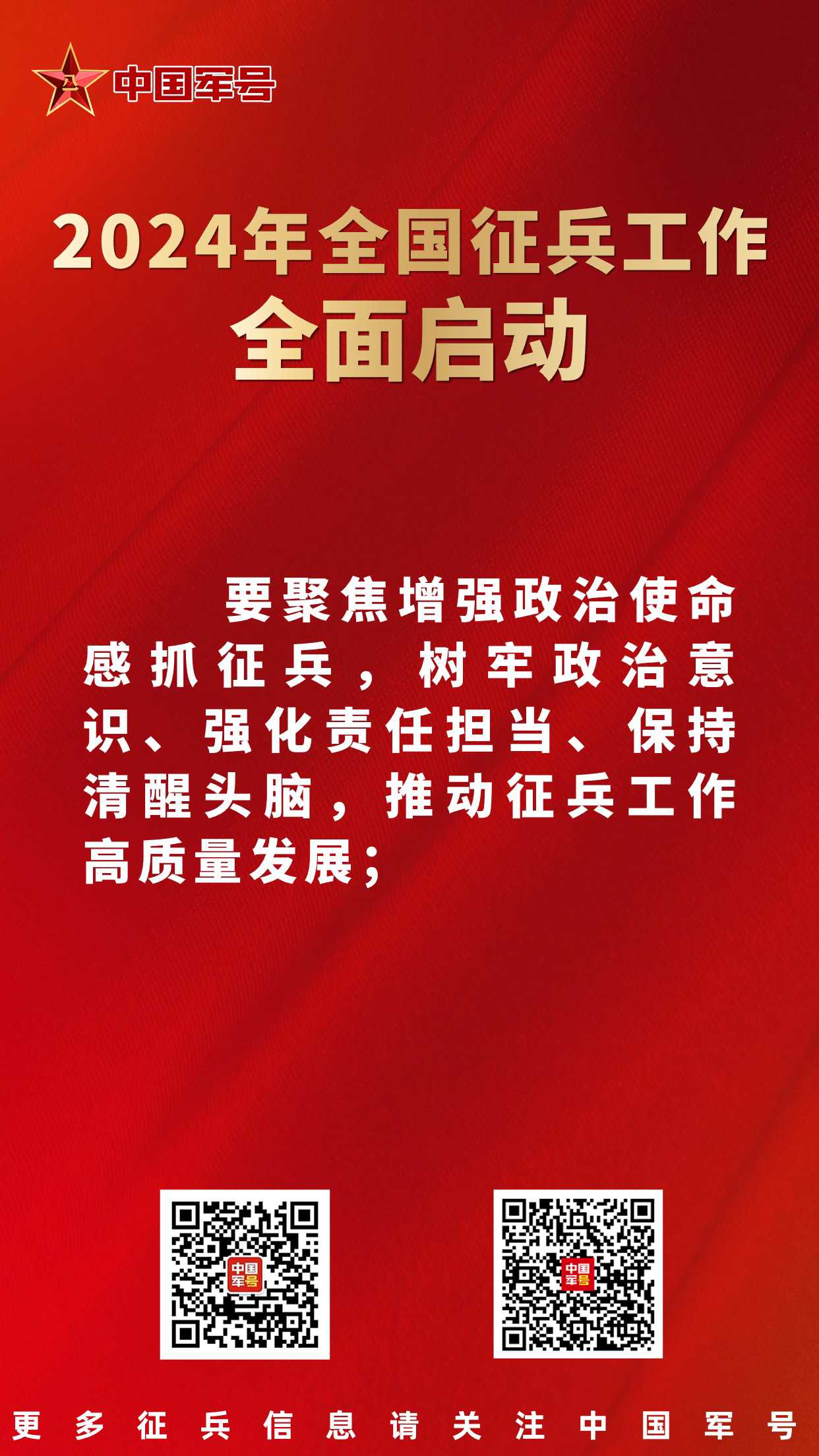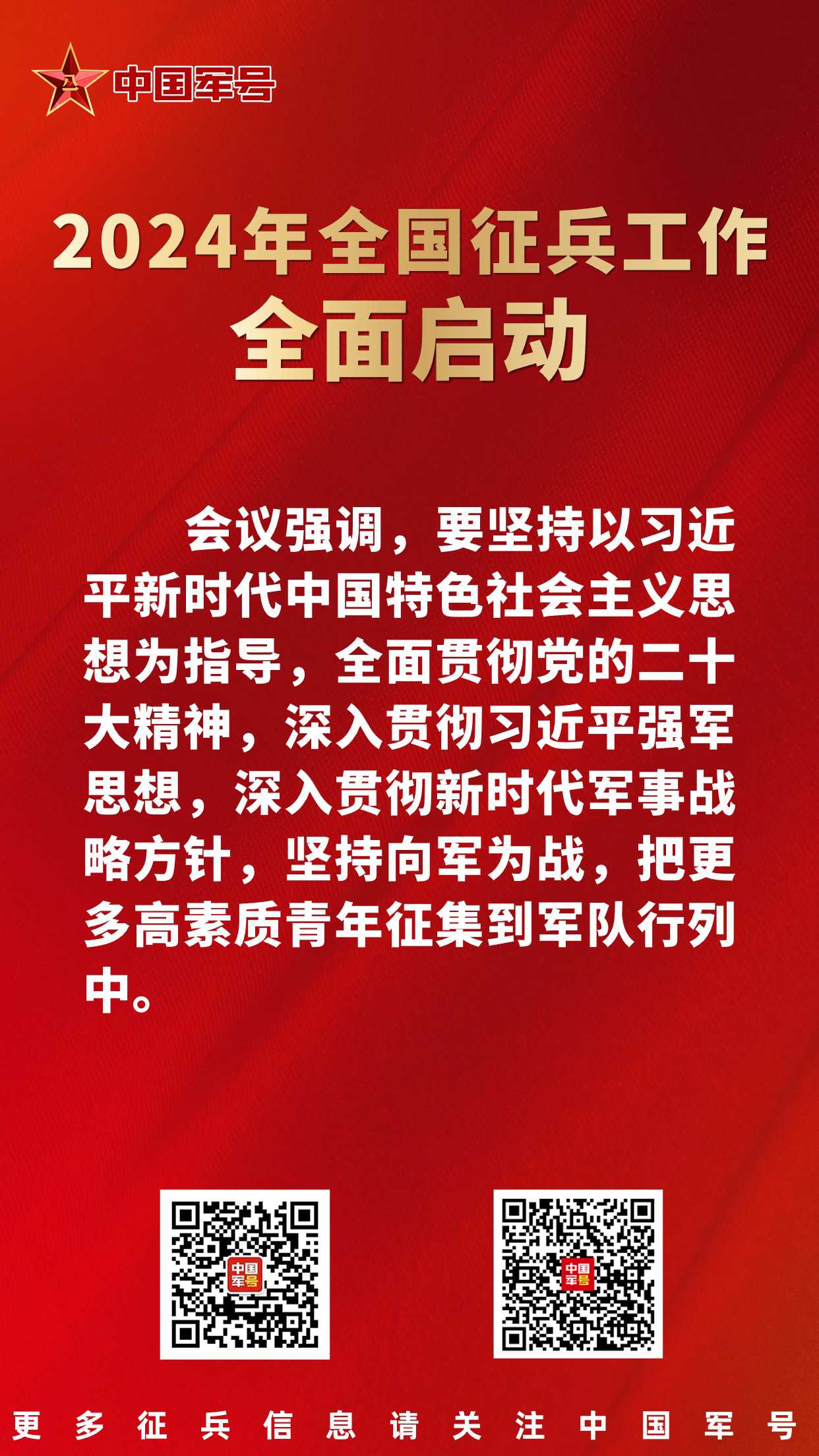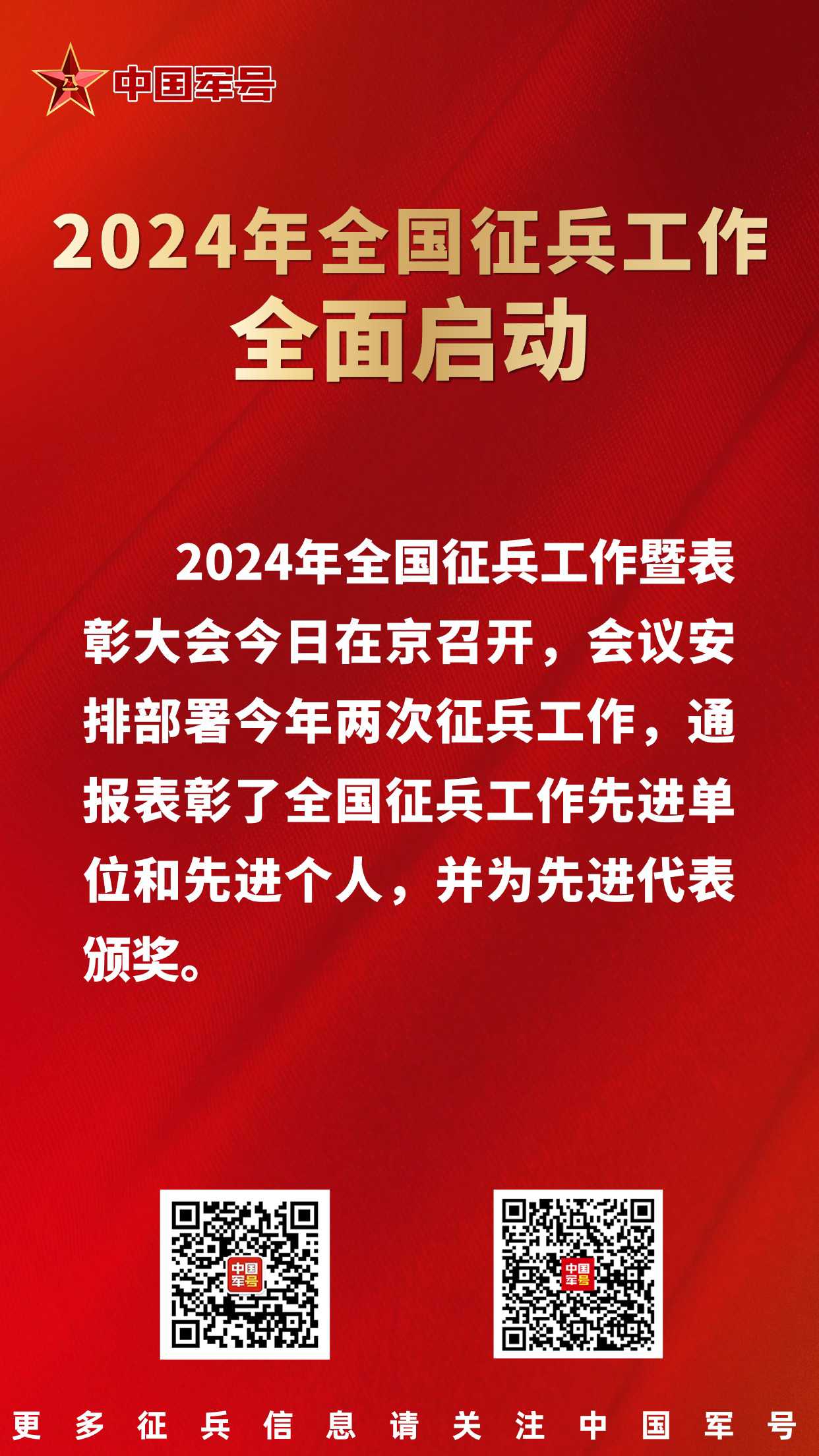 中国军号北京1月26日电 记者 贾启龙、王凌硕、贾二兵 报道:2024年全国征兵工作暨表彰大会今日在京召开,会议安排部署今年两次征兵工作,通报表彰了全国征兵工作先进单位和先进个人,并为先进代表颁奖。会议强调,要坚持以习近平新时代中国特色社会主义思想为指导,全面贯彻党的二十大精神,深入贯彻习近平强军思想,深入贯彻新时代军事战略方针,坚持向军为战,把更多高素质青年征集到军队行列中。