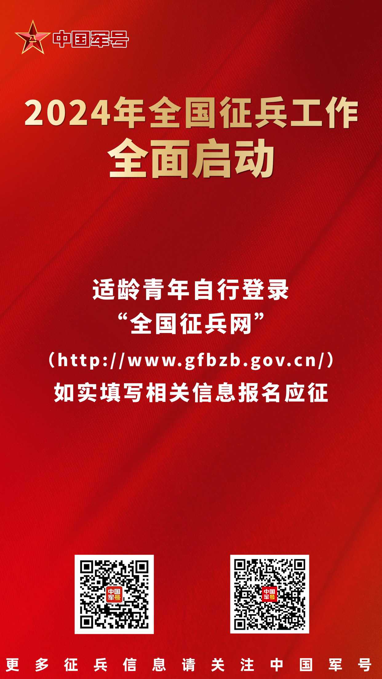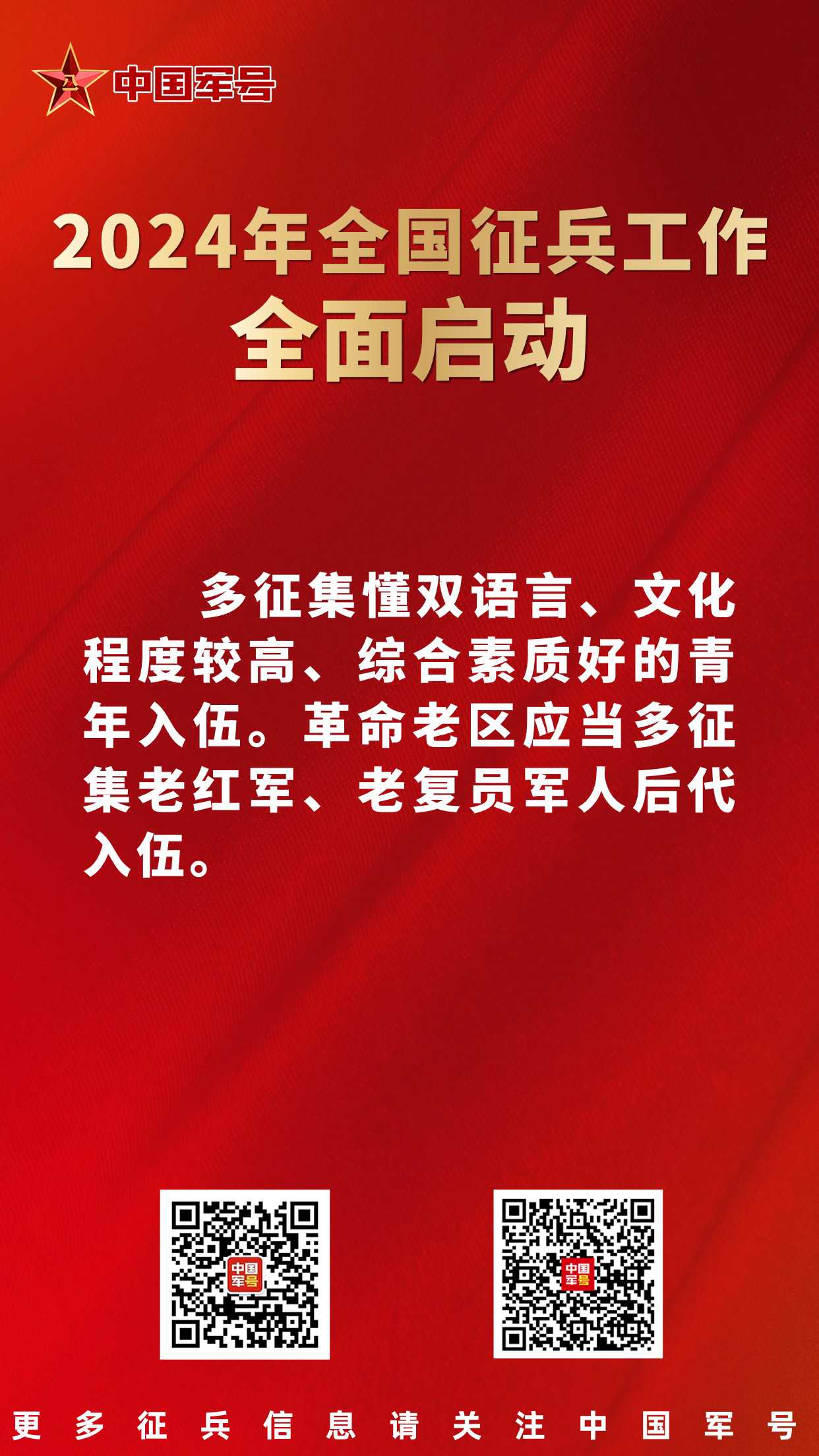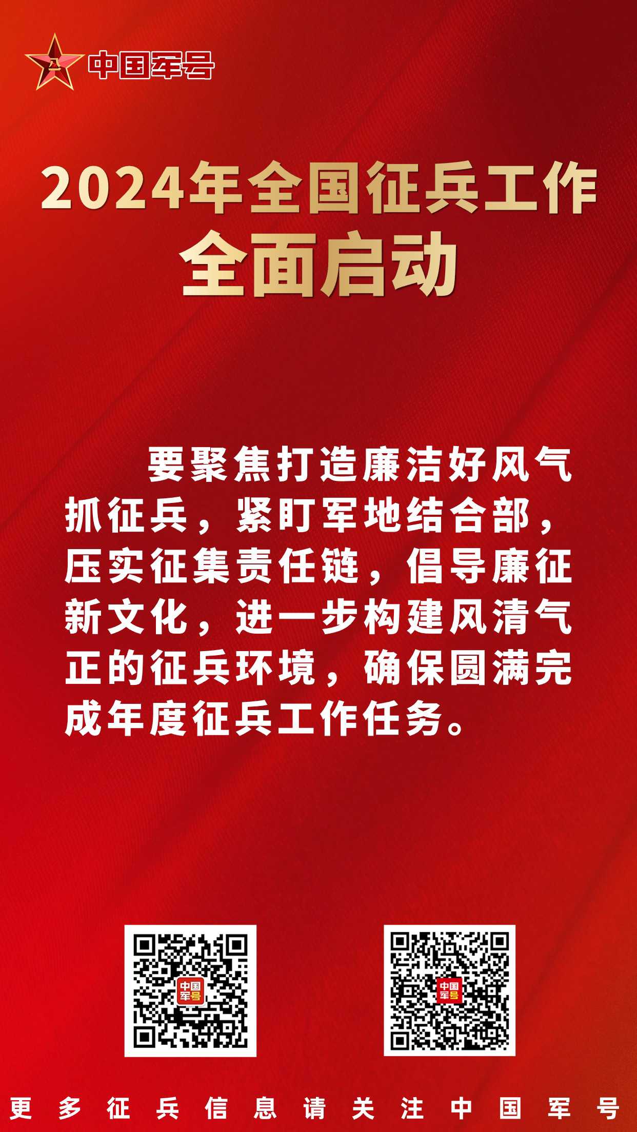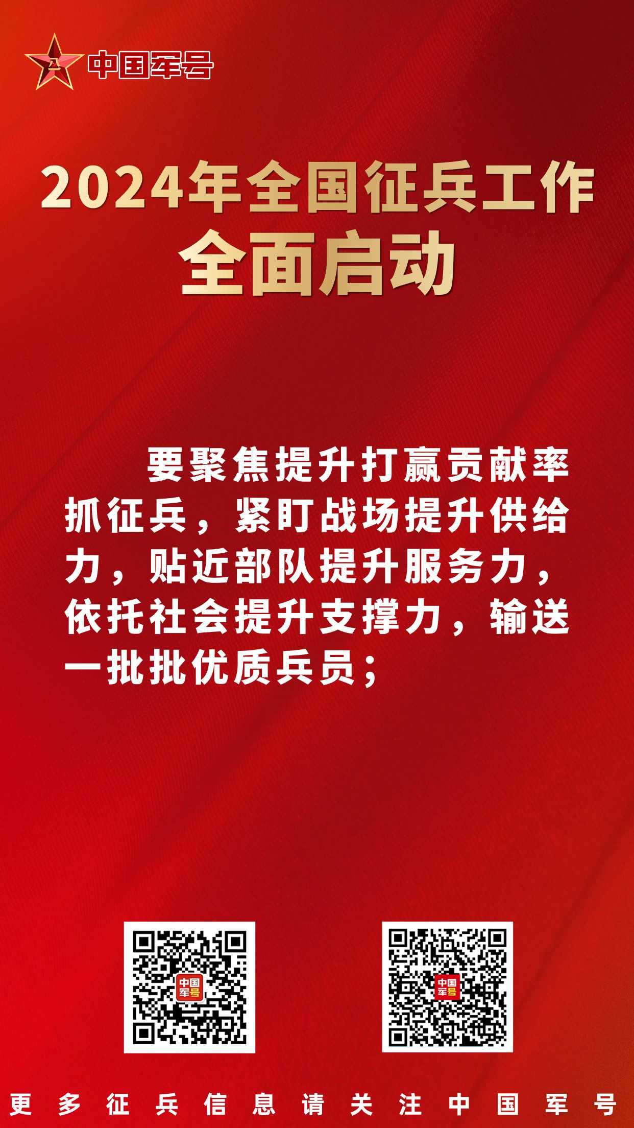 中国军号北京1月26日电 记者 贾启龙、王凌硕、贾二兵 报道:2024年全国征兵工作暨表彰大会今日在京召开,会议安排部署今年两次征兵工作,通报表彰了全国征兵工作先进单位和先进个人,并为先进代表颁奖。会议强调,要坚持以习近平新时代中国特色社会主义思想为指导,全面贯彻党的二十大精神,深入贯彻习近平强军思想,深入贯彻新时代军事战略方针,坚持向军为战,把更多高素质青年征集到军队行列中。