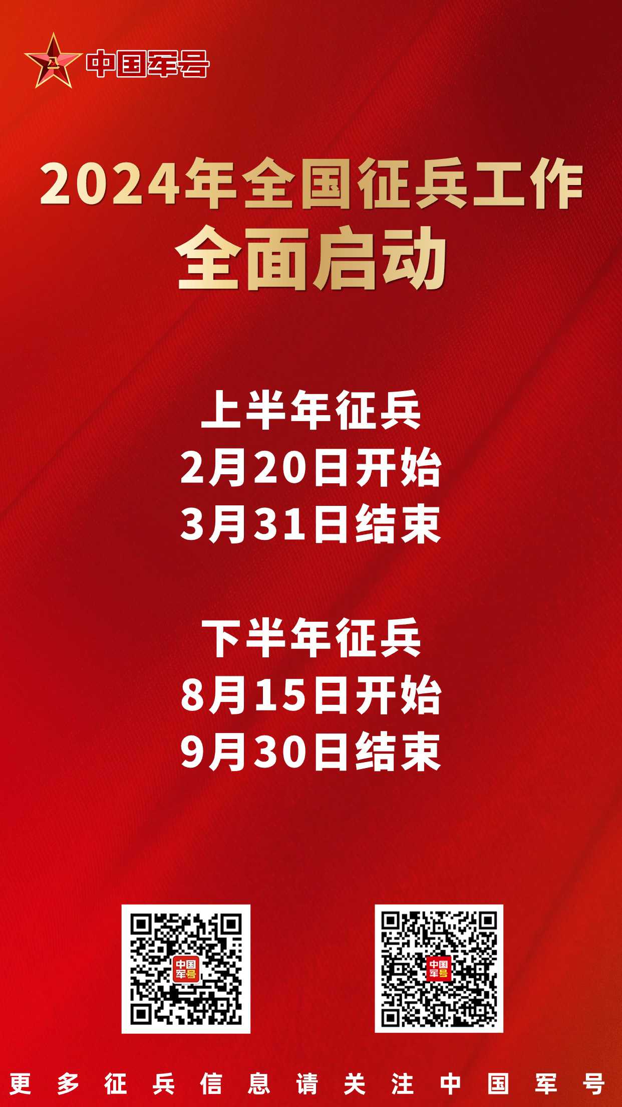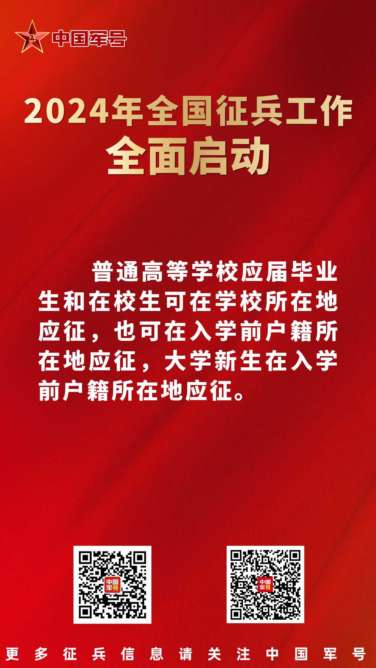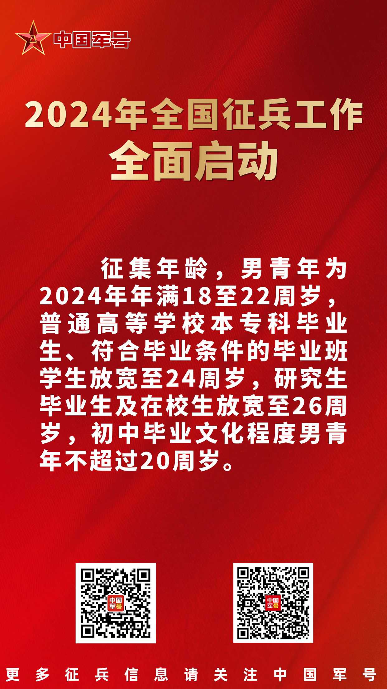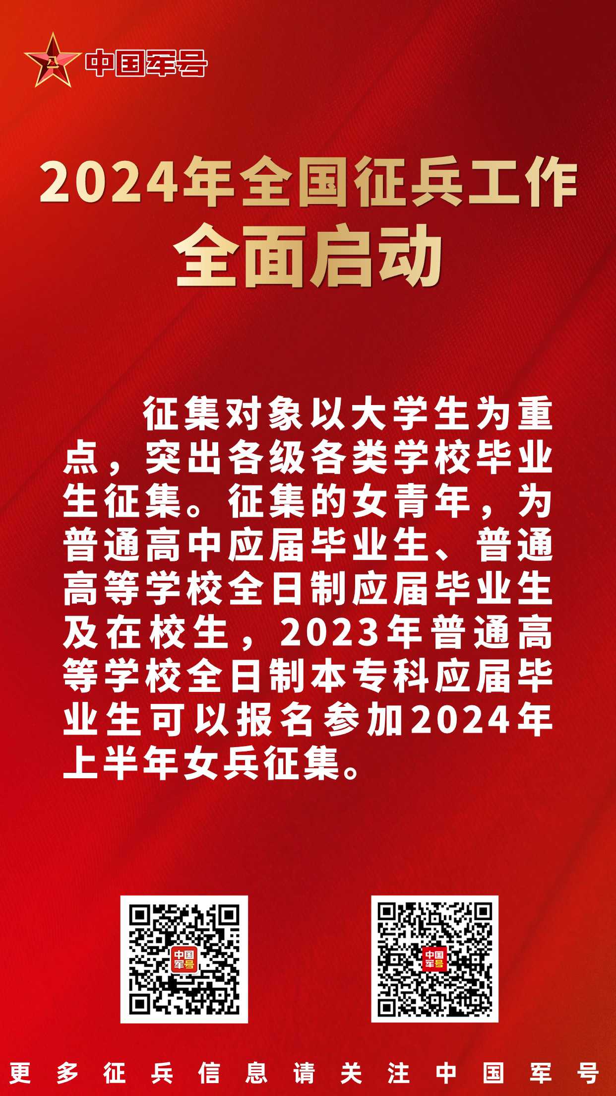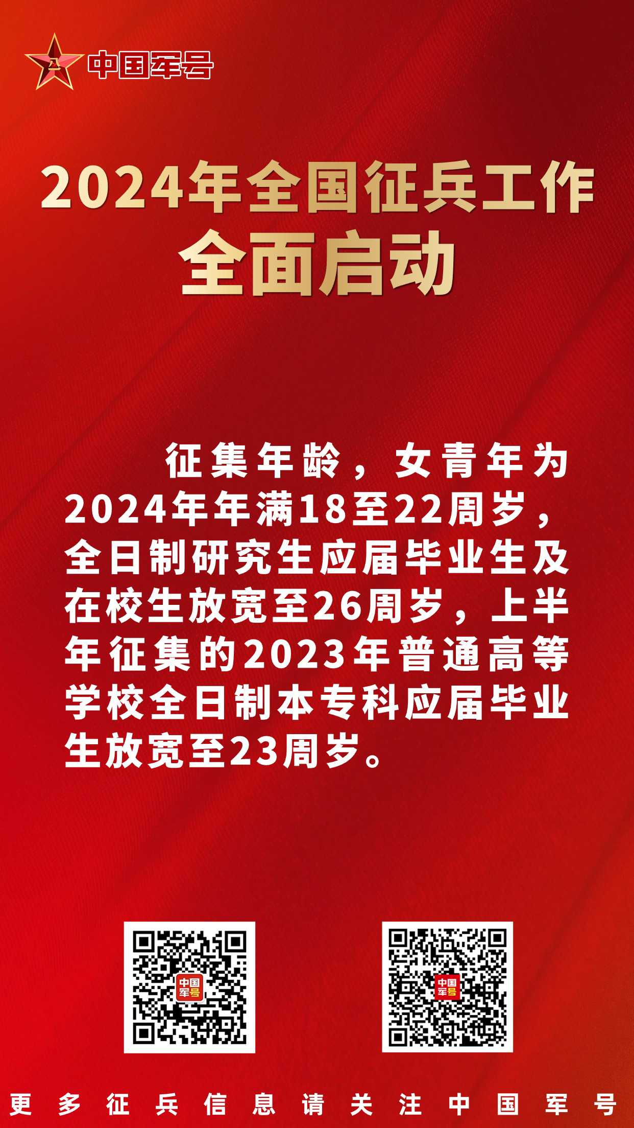 据悉,上半年征兵2月20日开始,3月31日结束;下半年征兵8月15日开始,9月30日结束。征集对象以大学生为重点,突出各级各类学校毕业生征集。征集的女青年,为普通高中应届毕业生、普通高等学校全日制应届毕业生及在校生,2023年普通高等学校全日制本专科应届毕业生可以报名参加2024年上半年女兵征集。征集年龄,男青年为2024年年满18至22周岁,普通高等学校本专科毕业生、符合毕业条件的毕业班学生放宽至24周岁,研究生毕业生及在校生放宽至26周岁,初中毕业文化程度男青年不超过20周岁;女青年为2024年年满18至22周岁,全日制研究生应届毕业生及在校生放宽至26周岁,上半年征集的2023年普通高等学校全日制本专科应届毕业生放宽至23周岁。