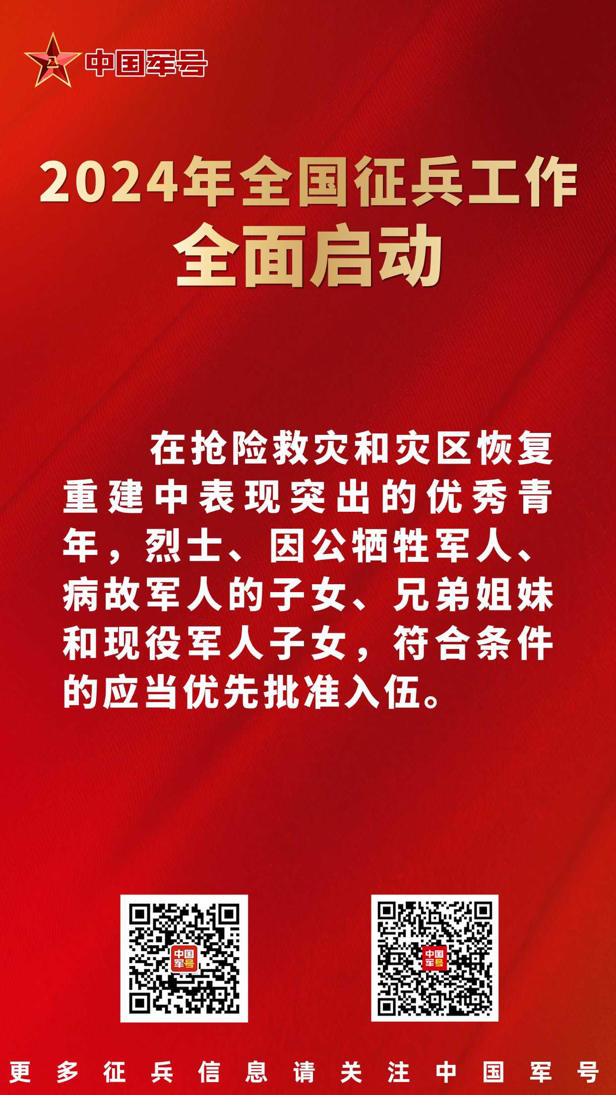 会议指出,在抢险救灾和灾区恢复重建中表现突出的优秀青年,烈士、因公牺牲军人、病故军人的子女、兄弟姐妹和现役军人子女,符合条件的应当优先批准入伍。多征集懂双语言、文化程度较高、综合素质好的青年入伍。革命老区应当多征集老红军、老复员军人后代入伍。