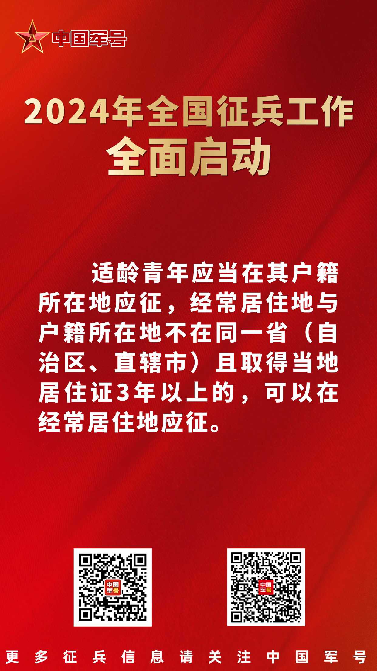 会议明确,适龄青年应当在其户籍所在地应征,经常居住地与户籍所在地不在同一省(自治区、直辖市)且取得当地居住证3年以上的,可以在经常居住地应征。普通高等学校应届毕业生和在校生可在学校所在地应征,也可在入学前户籍所在地应征,大学新生在入学前户籍所在地应征。适龄青年自行登录“全国征兵网”(http://www.gfbzb.gov.cn/),如实填写相关信息报名应征。