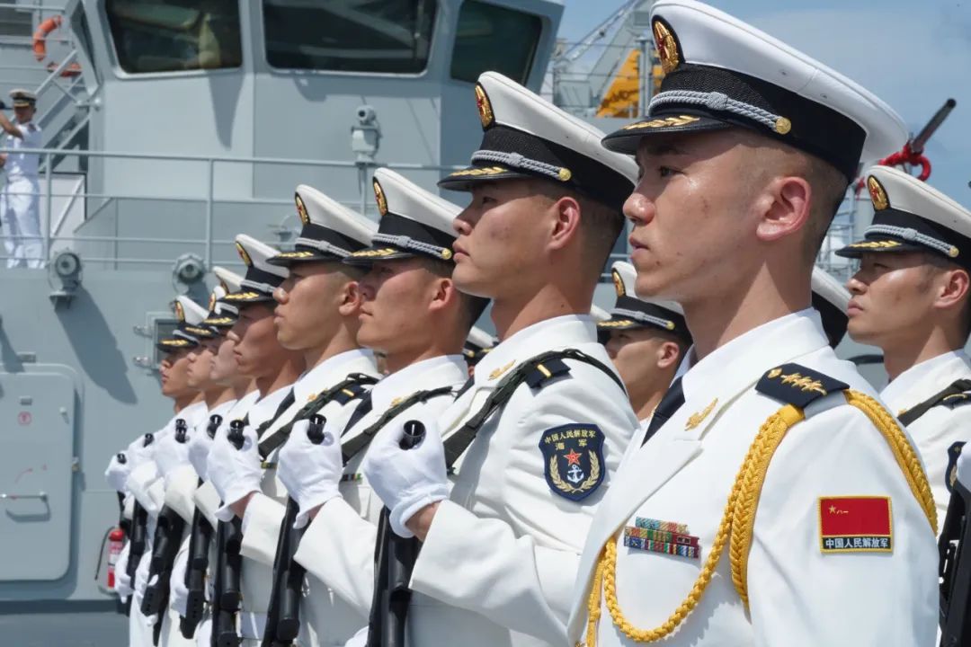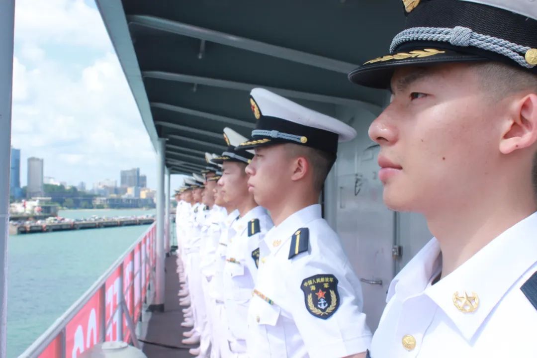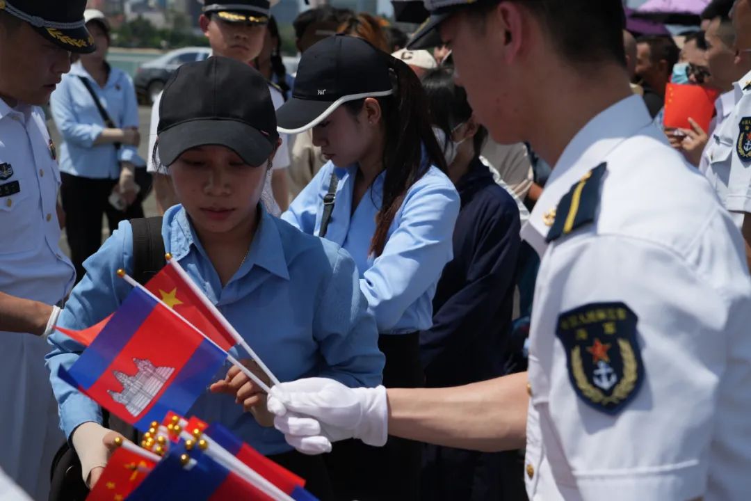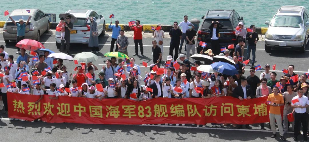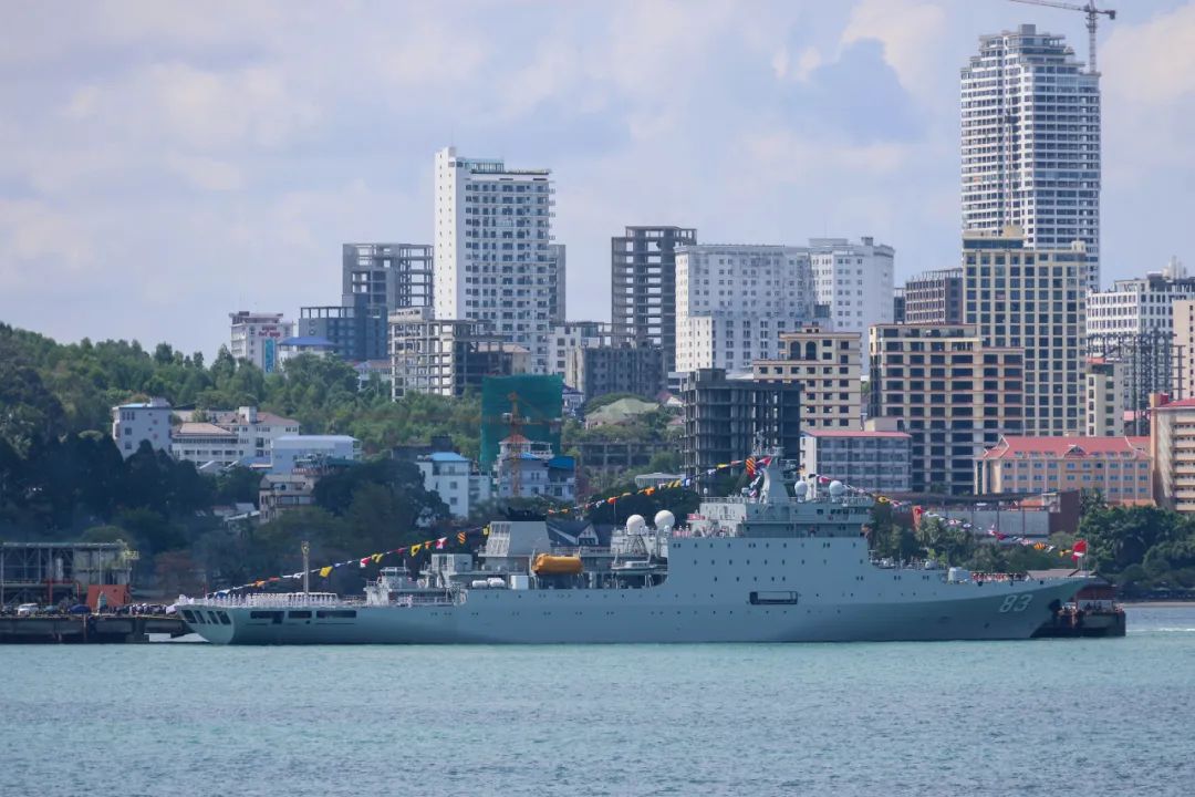 当地时间上午10时,海军83舰编队靠上西哈努克港码头。中国驻柬埔寨大使王文天等军地领导、中资机构代表、华人华侨代表、柬埔寨军方领导及海军官兵代表等300余人到码头迎接。