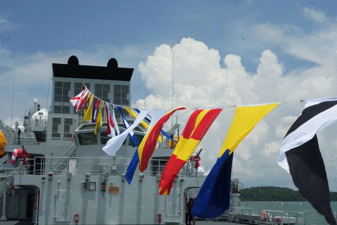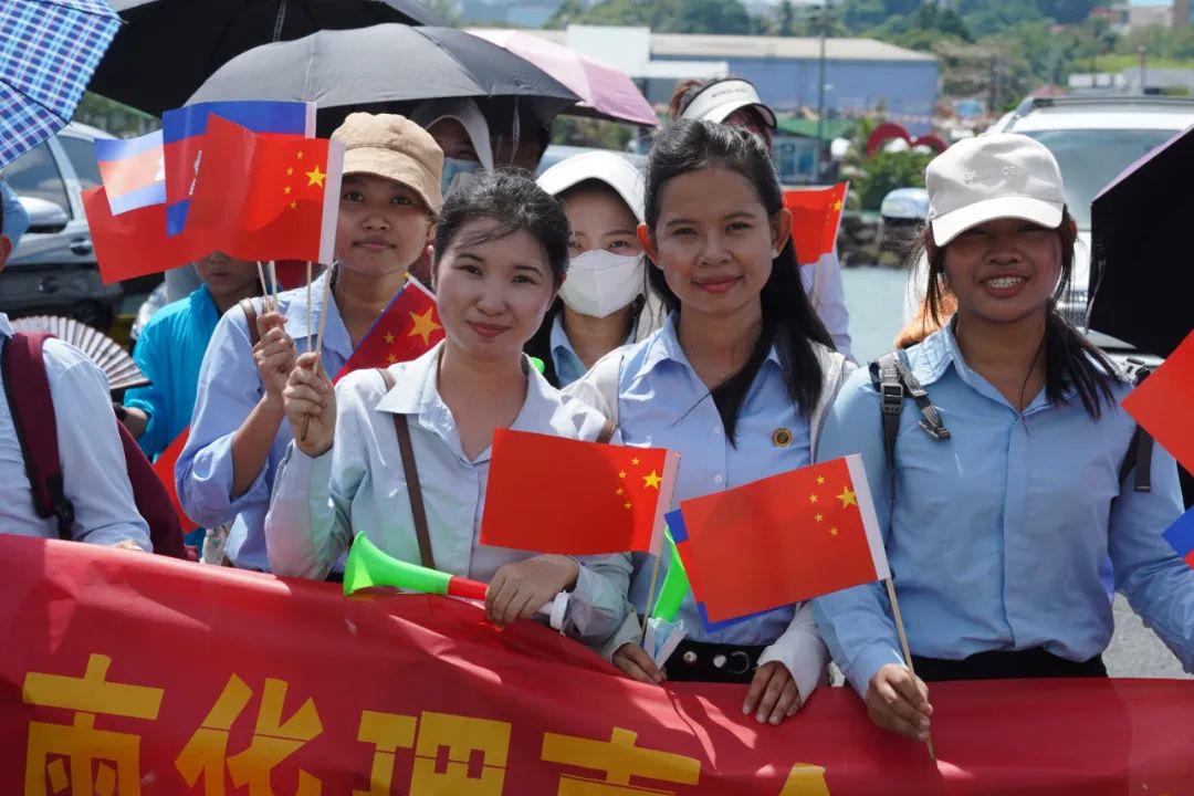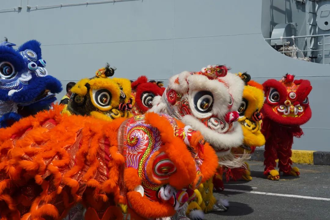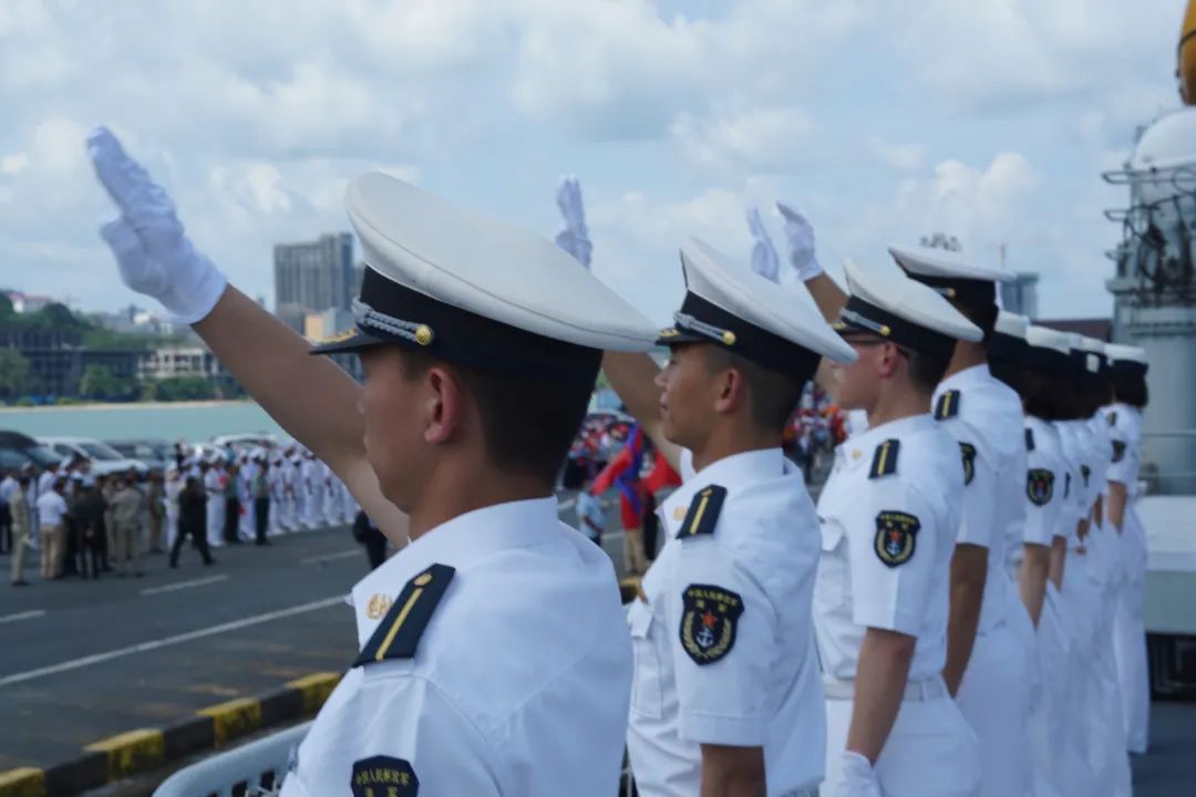 欢迎仪式上,柬方向我任务指挥员献上鲜花、互致问候。欢迎仪式结束后,王文天大使登上海军戚继光舰,检阅了仪仗队。