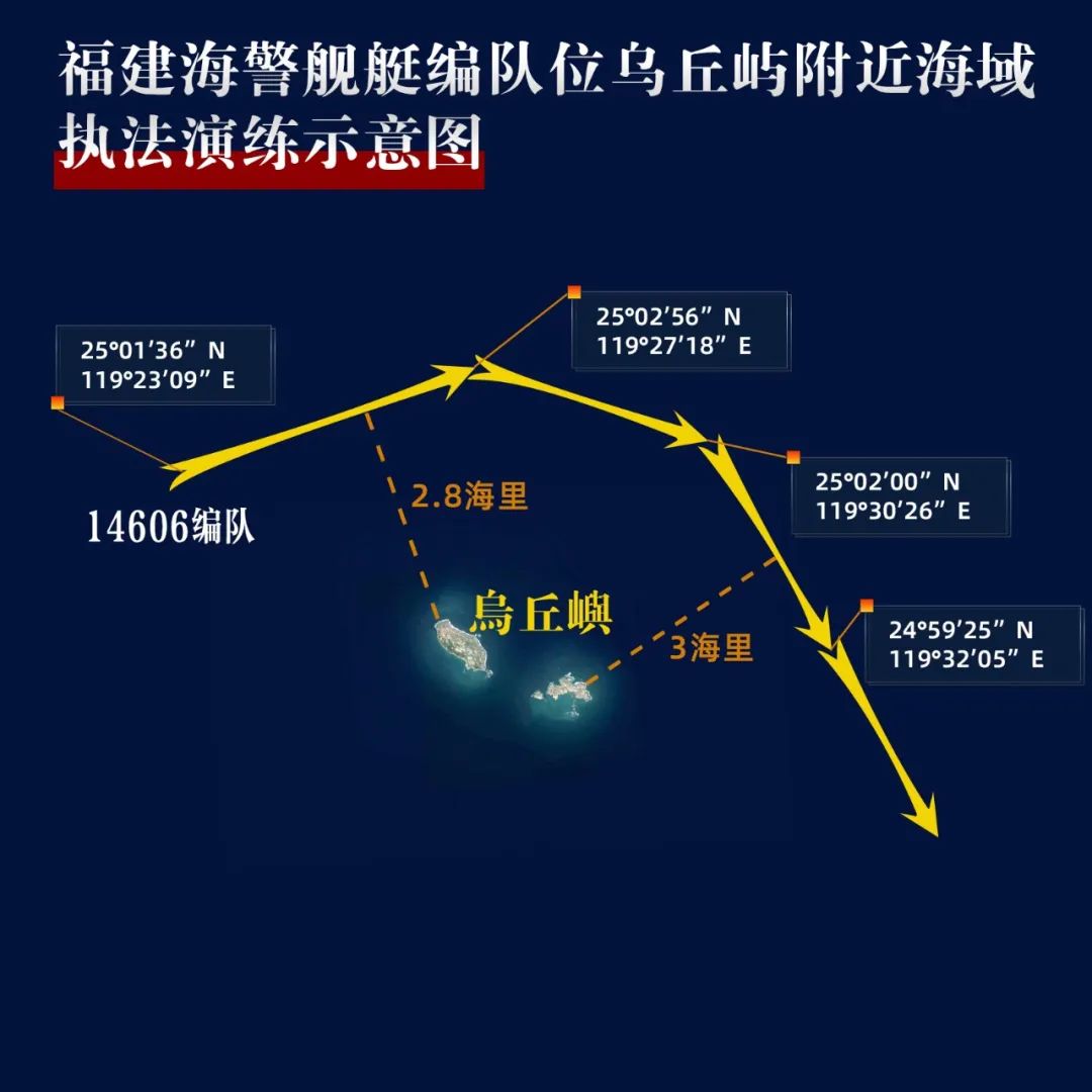 中国海警局新闻发言人甘羽表示,5月23日,福建海警组织舰艇编队位乌丘屿、东引岛附近海域开展综合执法演练,检验联合巡航、快速反应及应急处置能力。