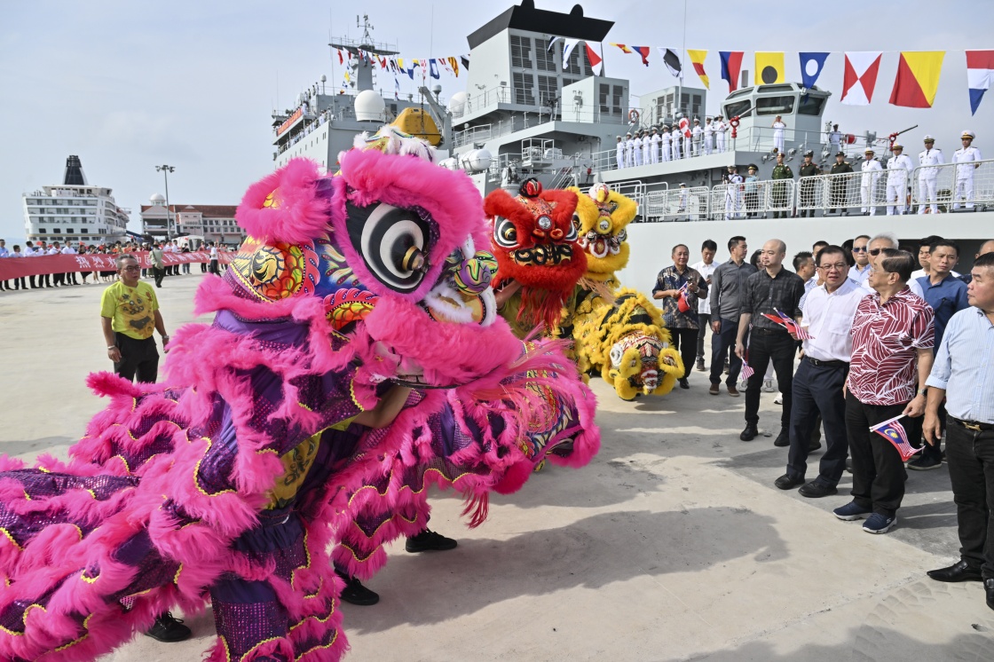 10月5日,在马来西亚槟城港,马方组织舞狮表演欢迎到访的中国海军戚继光舰、井冈山舰。新华社记者 程一恒 摄