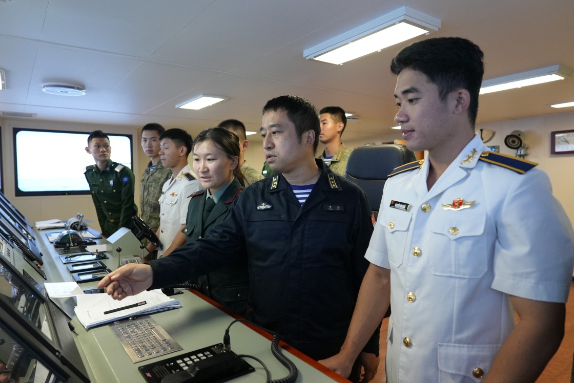 10月24日,海军工程大学中外学员在中国海军戚继光舰上进行模拟驾驶课目训练。新华社发(卢家平 摄)