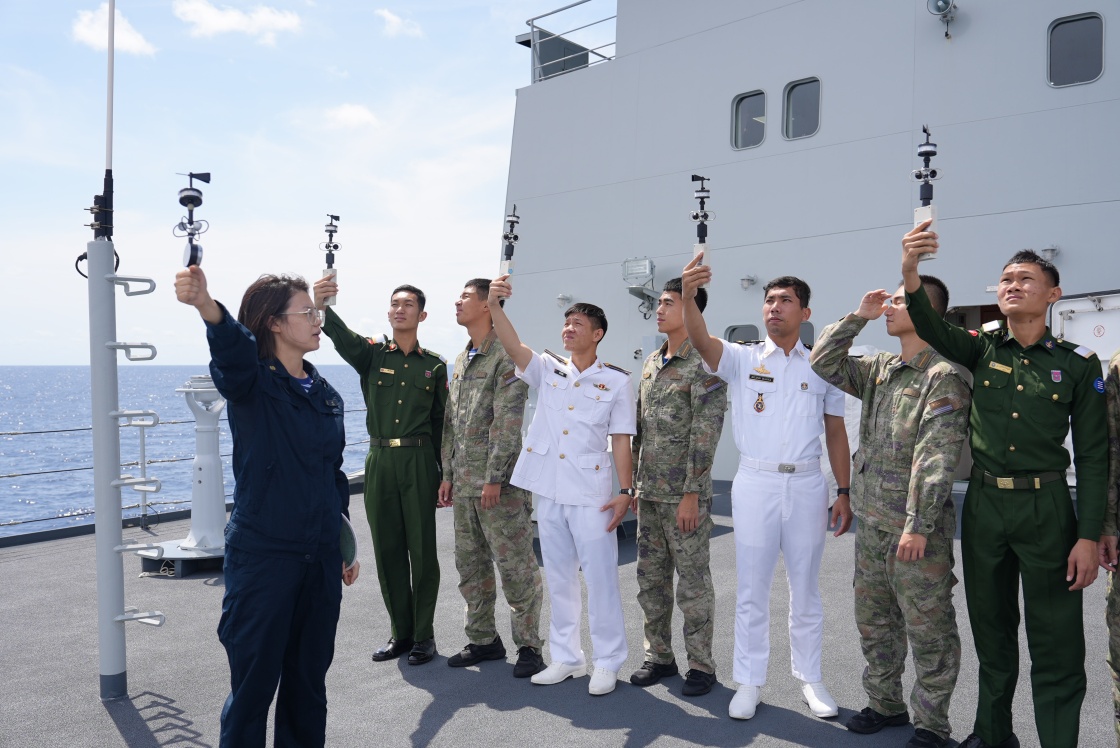 10月24日,海军工程大学教员在中国海军戚继光舰甲板上向中外学员教授风向风速测定课目。新华社发(喻俊浩 摄)