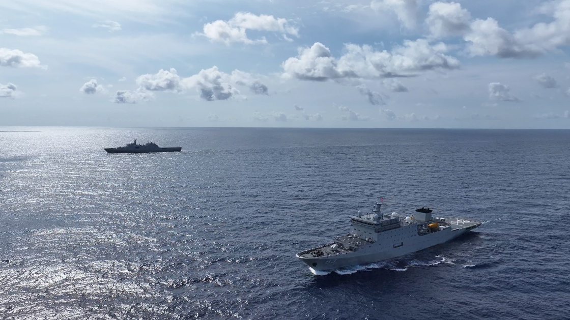 10月24日,中国海军戚继光舰(下)、井冈山舰(上)在太平洋上编队航行(视频截图)。新华社发(喻俊浩 摄)