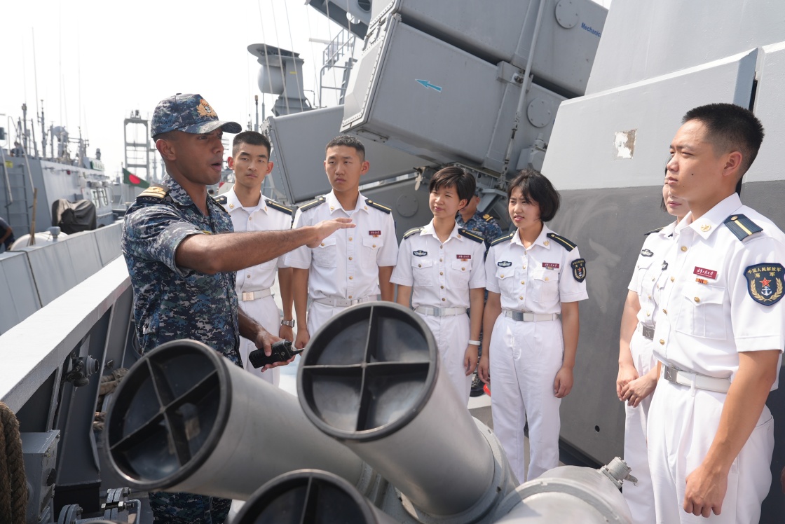 10月13日,执行海军工程大学远海实习访问任务的学员在孟加拉国海军舰艇上进行友好交流。新华社发(明永盛 摄)