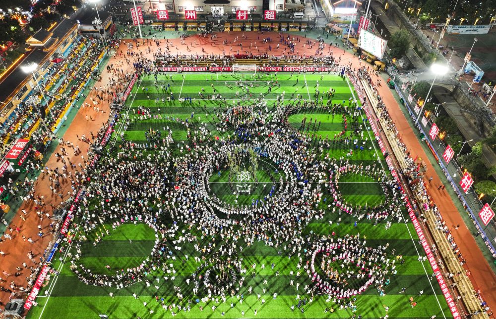 8月23日,人们在贵州“村超”球场跳苗族芦笙舞(无人机照片)。2025年首届“村超”全国赛总决赛在贵州榕江县“村超”球场举行。广东肇庆金利诚峻足球队2:0战胜广东和平商会足球队,斩获全国总冠军。赛事期间同时举办丰富多彩的民族歌舞展演、无人机表演、大型烟花秀,吸引数万观众现场观赛。新华社记者杨文斌摄