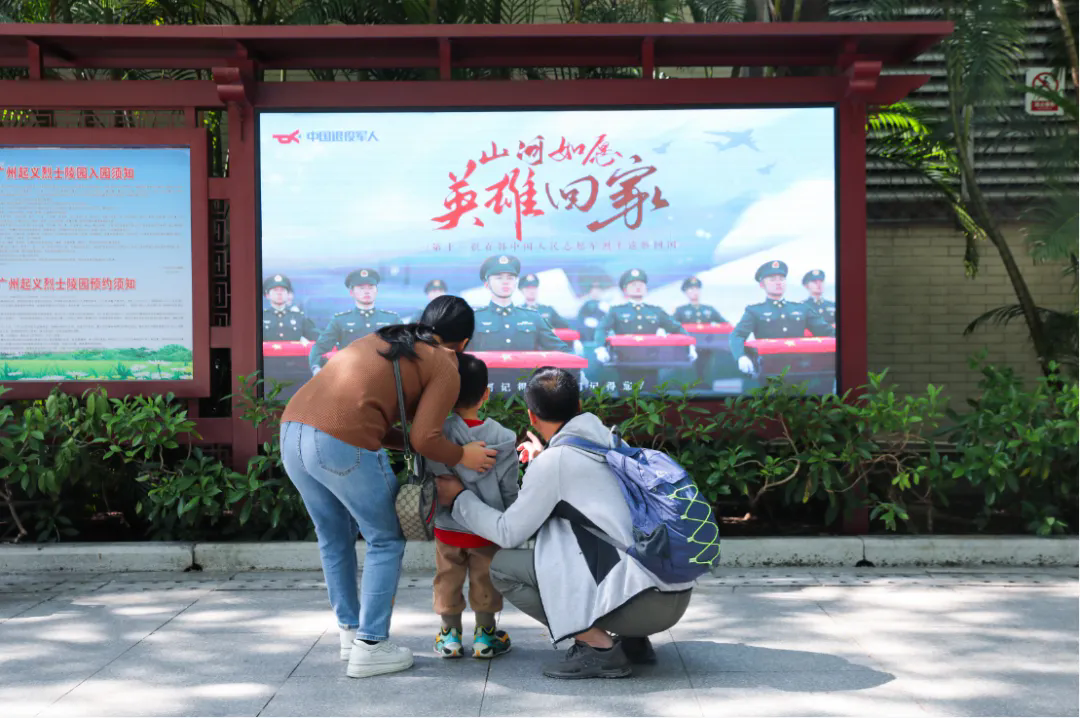 文化宫门前台阶下,立着“山河如愿 英雄回家”展板,不时有人前来合影打卡。