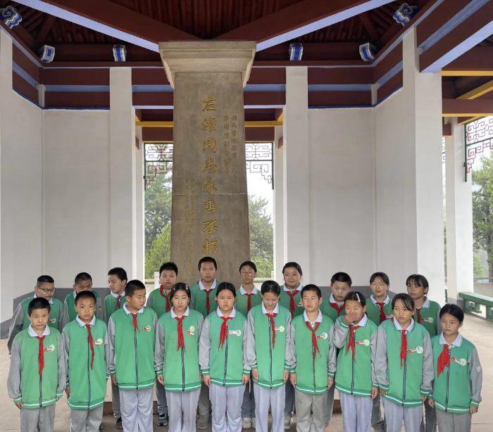 2025年5月23日,泽城九年一贯制学校五、六年级的学生举行活动纪念左权将军。(新华网 于杨 摄)