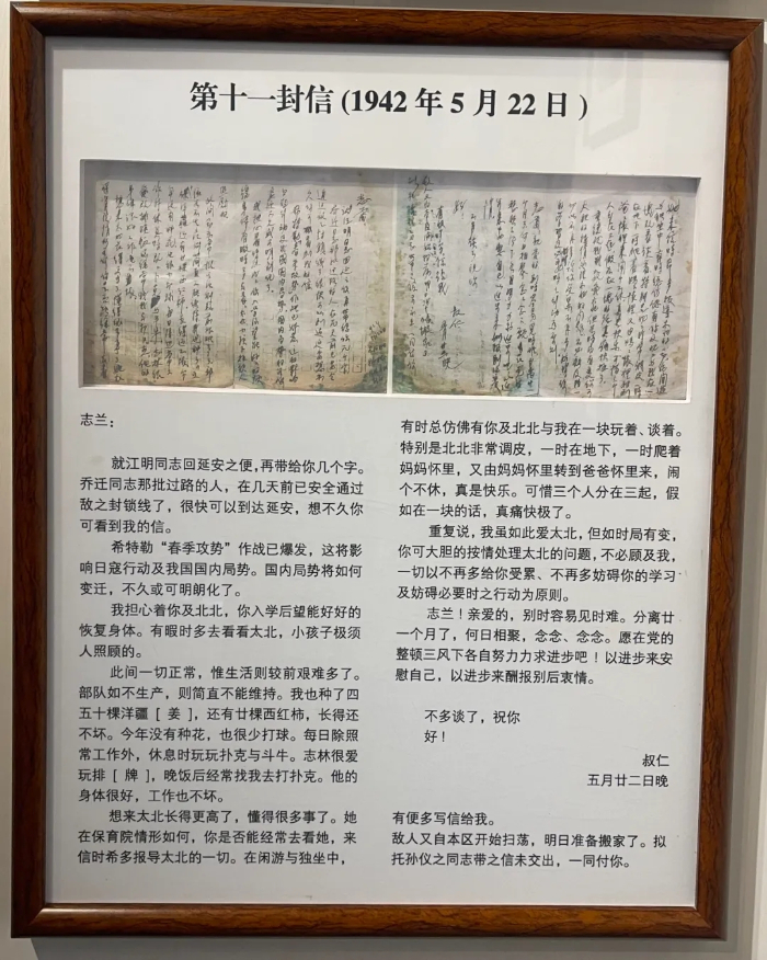 “前述郭述申同志带给你的一包东西:有几件衣服几张花布一封信,听说过封锁线时都丢掉了,可惜那几张不坏也还好看,想着你替小太北做成衣服后,满可给小家伙漂亮一下,都掉了,这怪不得做爸爸的,只是小家伙运气太不好了。”