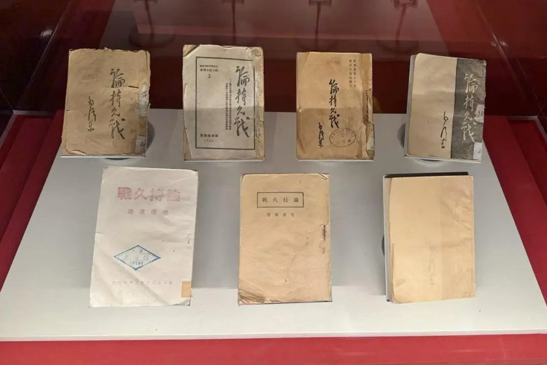 延安革命纪念馆展出的多个版本的《论持久战》。(新华网 李哲贤 摄)