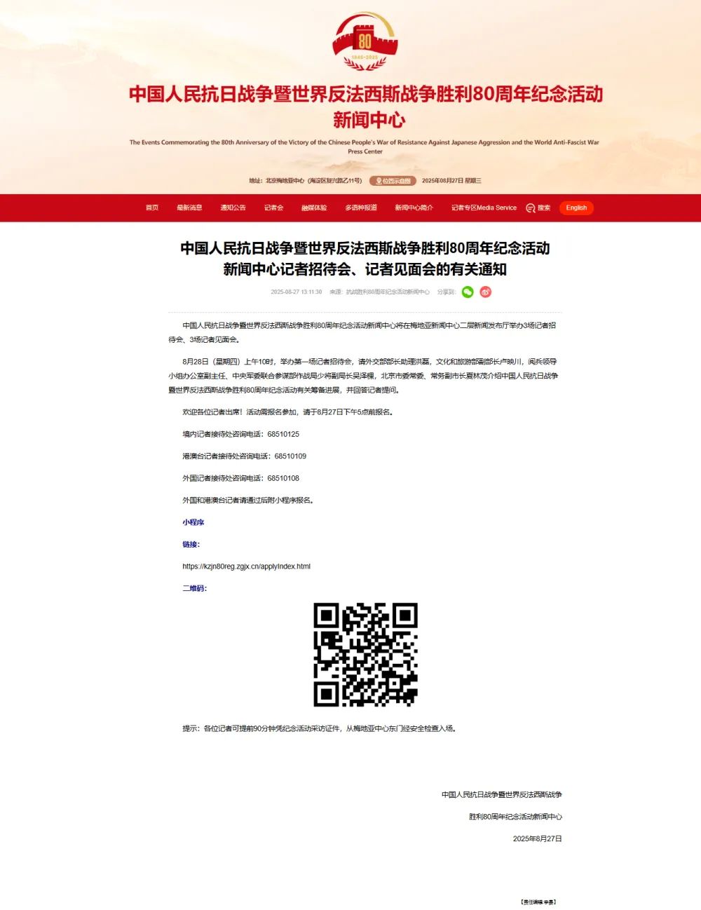 抗战胜利80周年纪念活动新闻中心将举办3场记者招待会、3场记者见面会
