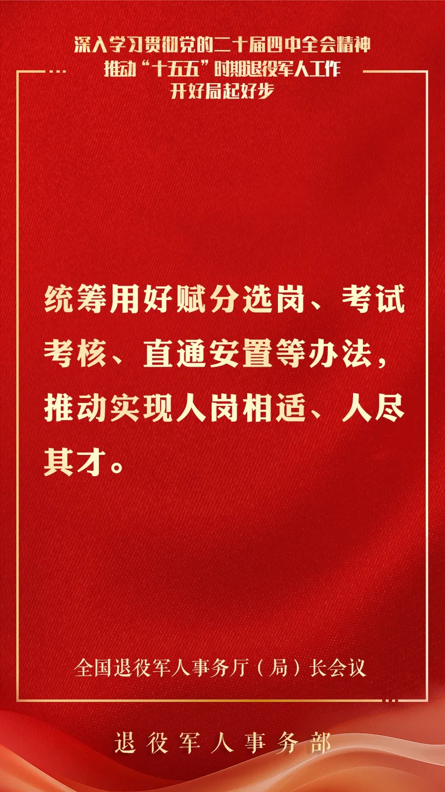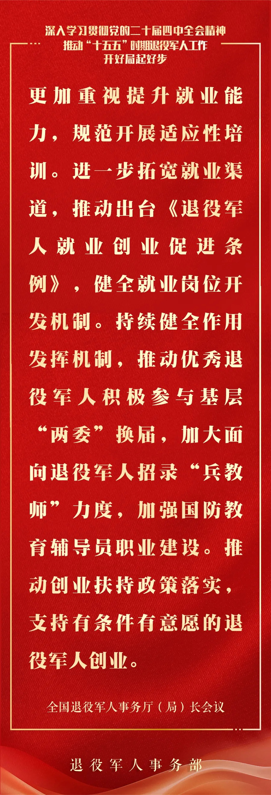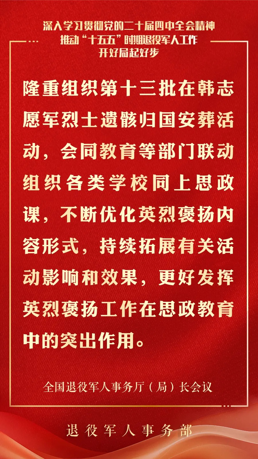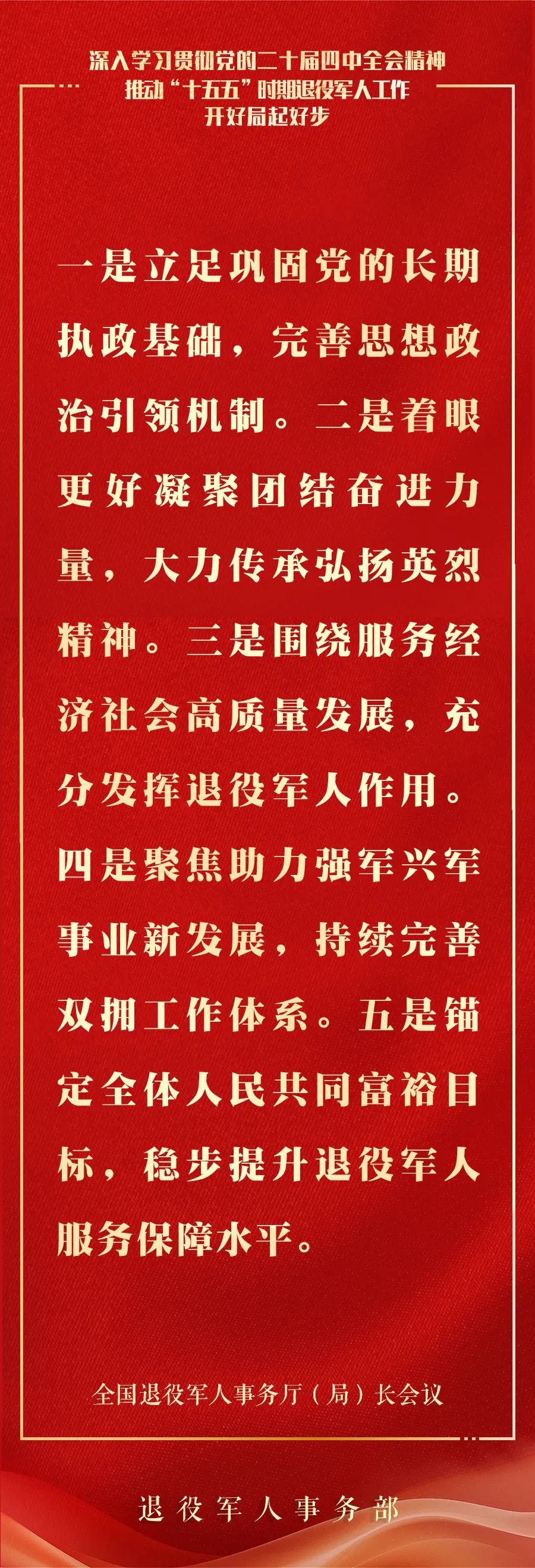 推动接收安置更加高效、服务保障更加精准、教育管理更加扎实、作用发挥更加充分、权益维护更加有力,引领广大退役军人积极投身社会主义现代化建设,助力“十五五”实现良好开局。