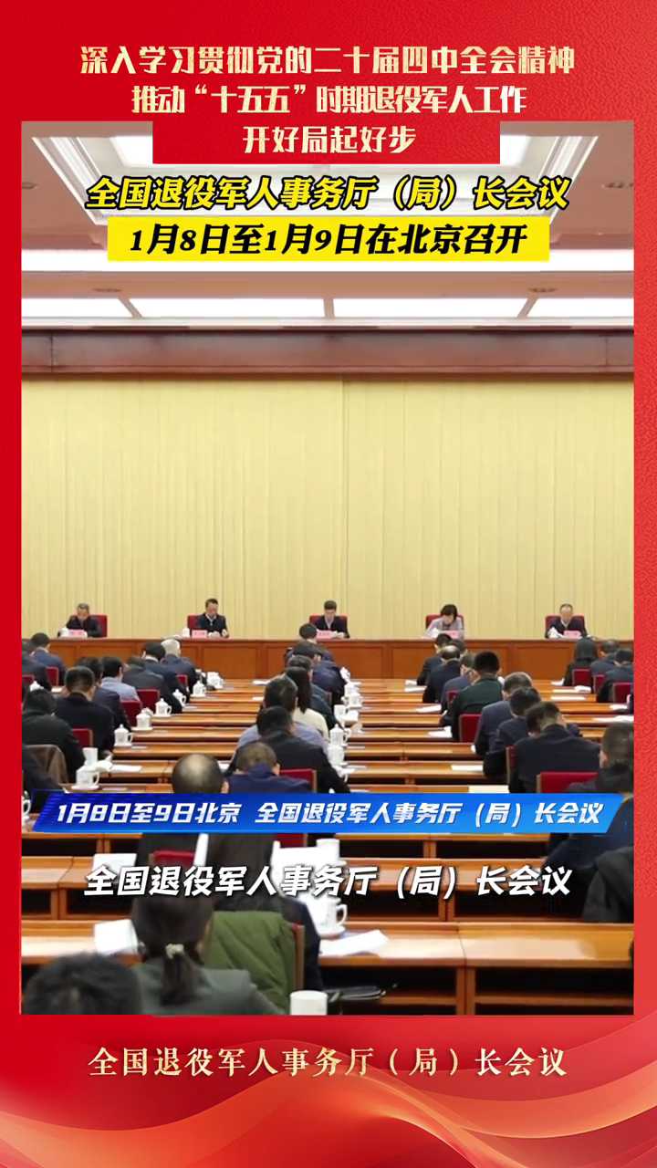 1月8日至9日,全国退役军人事务厅(局)长会议在京召开。各省(区、市)、新疆生产建设兵团退役军人事务厅(局)主要负责同志,驻部纪检监察组、部机关各司(局)、各直属单位以及部管社会组织负责同志参加会议。