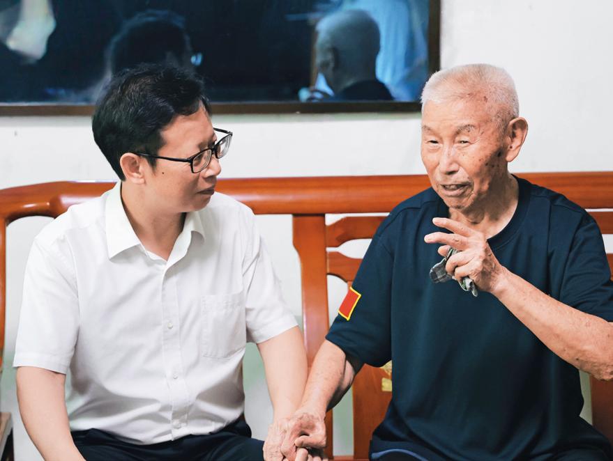 2025年7月16日,谢春(左)赴湖南省邵阳市大祥区慰问退役军人伍先平。 刘思思 摄