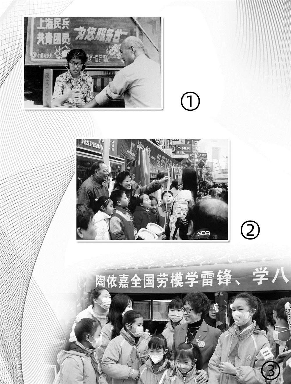图①:1982年3月,陶依嘉在“为您服务台”前为群众量血压。图②:上世纪90年代,陶依嘉在南京路为群众量身高。图③:2023年,陶依嘉带领小学生开展志愿服务活动。图片由受访者供图