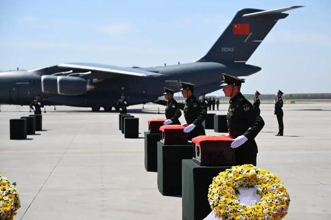 11时25分,空军运-20B专机载着12位志愿军烈士遗骸及146件遗物,缓缓降落在桃仙国际机场。两道水柱冲天而起,架起一座虹桥;4架歼-20低空通场,列阵致敬。